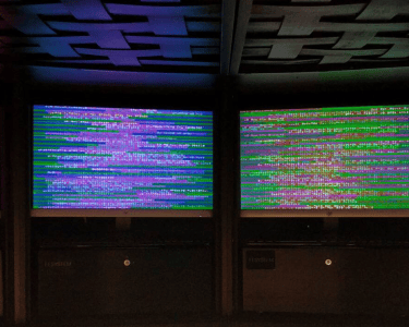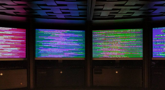 The screens are continually in motion, scrolling Fibonacci sequences upwards and downwards in several colors on the screen, aligned with units of time, (Fibonacci 5 = 5 seconds, then 8 seconds) speeding up and then slowing down to loop back and repeat.